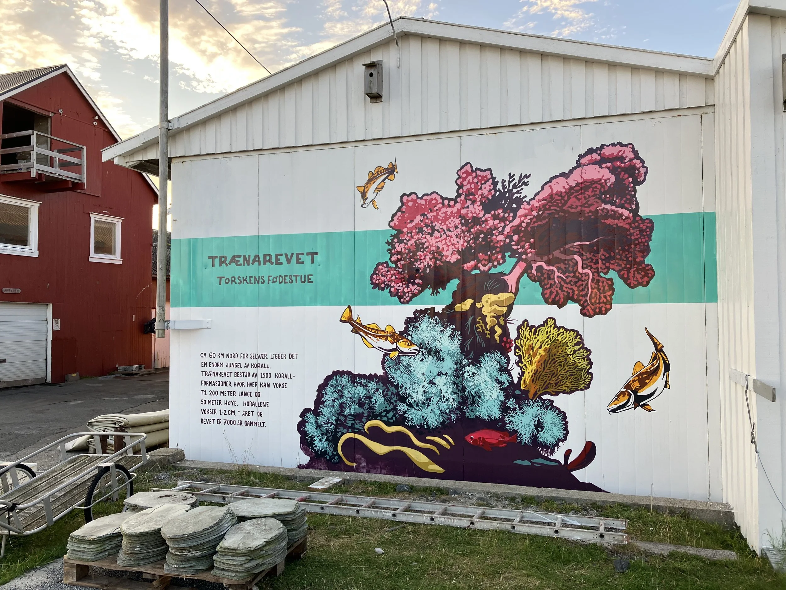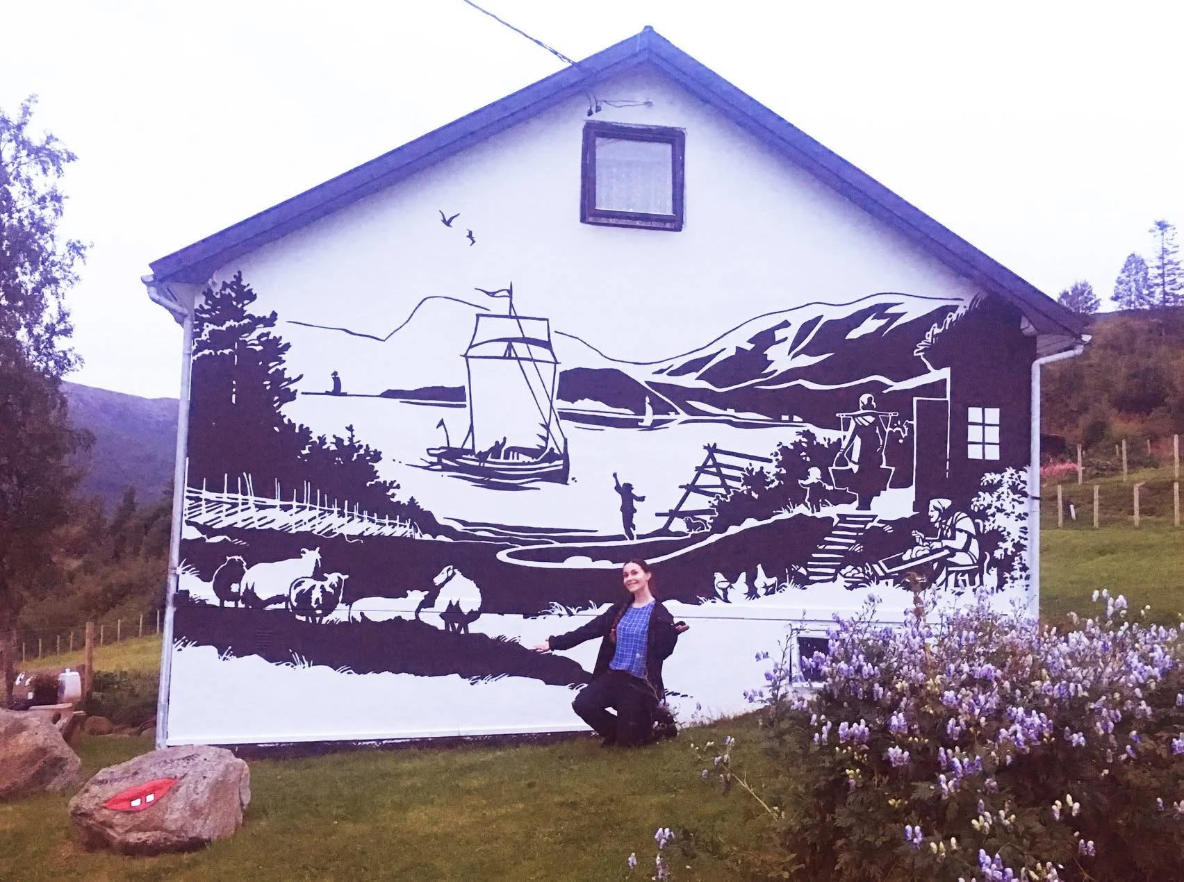 Jeg har veggmaleri flere steder rundt omkring! I Træna har jeg laget hele ni veggmaleri i stort og smått, inne og ute - og mine penselstrøk finnes også i Kabelvåg, Hamarøy, Levang, Lurøy og i 2025 laget jeg også ett i Vágur på Færøyene. Veggmalingen startet i 2013 og blir stadig større og mer ambisiøse.